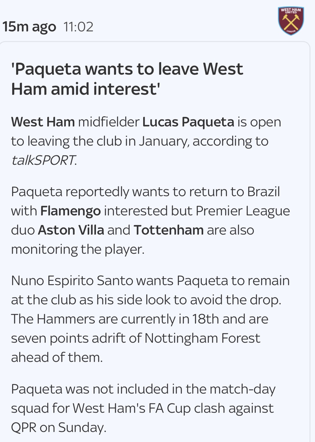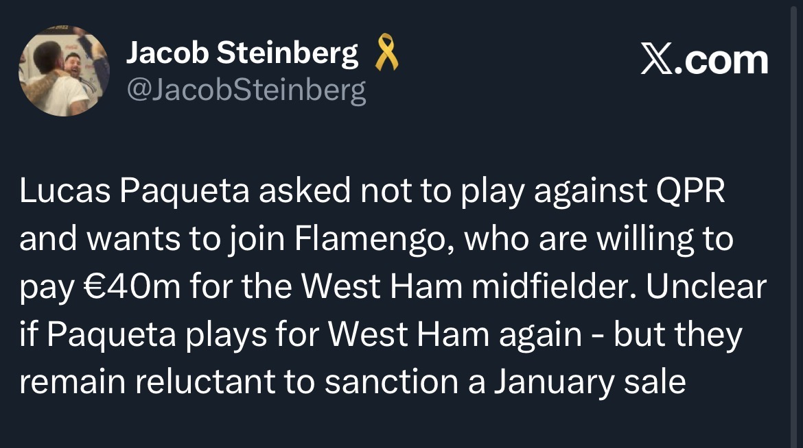 With the same amount of games played in the league but 100 more minutes than Benrahma, he’s got one more goal and 6 fewer assists. There wasn’t too much concern when Benrahma left and I don’t think there should be any more about Paqueta. He’s not the player who’s going to get us out of a relegation battle (he’s basically admitting that himself) and if we’re going down he’s going to be worth less when that happens.
